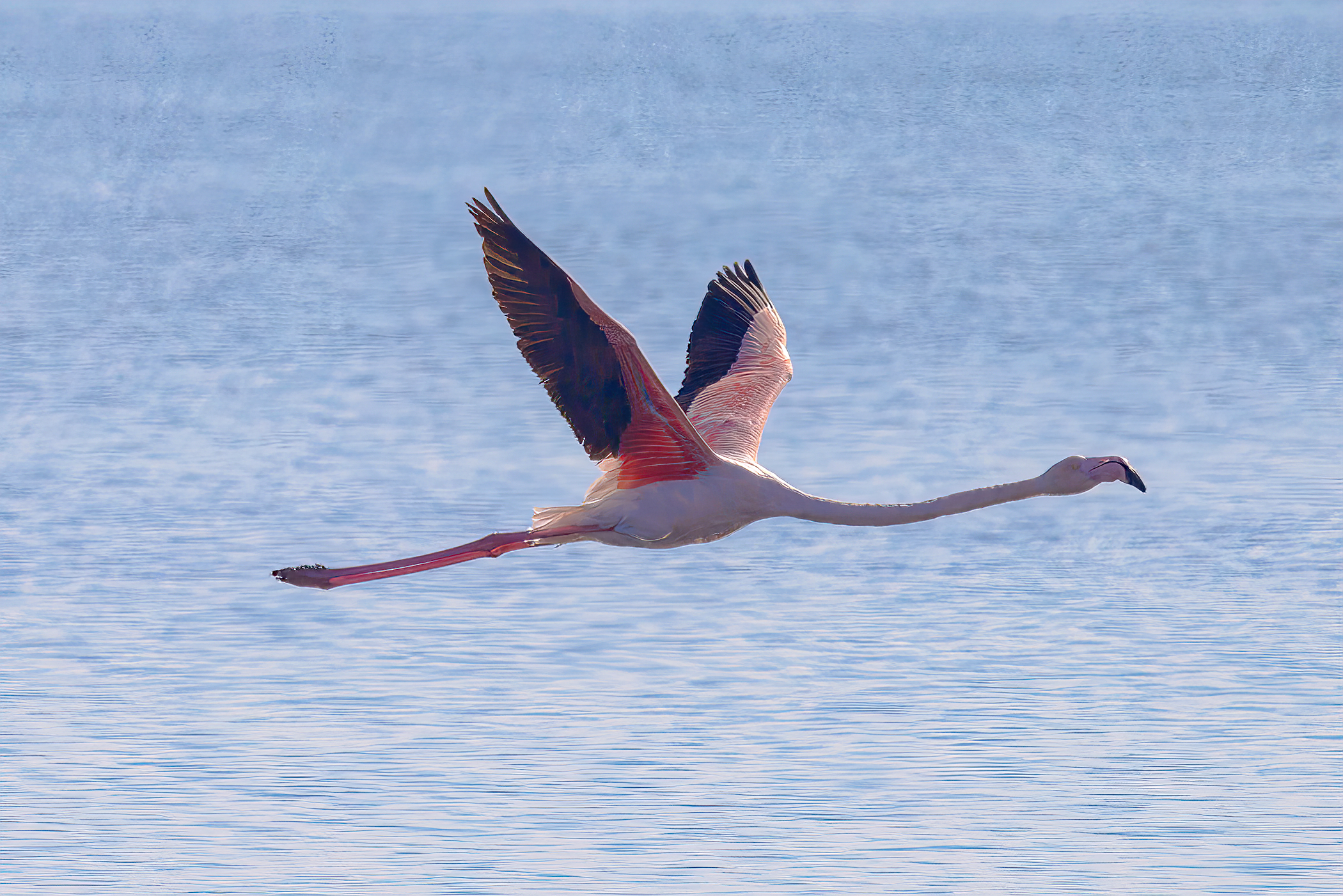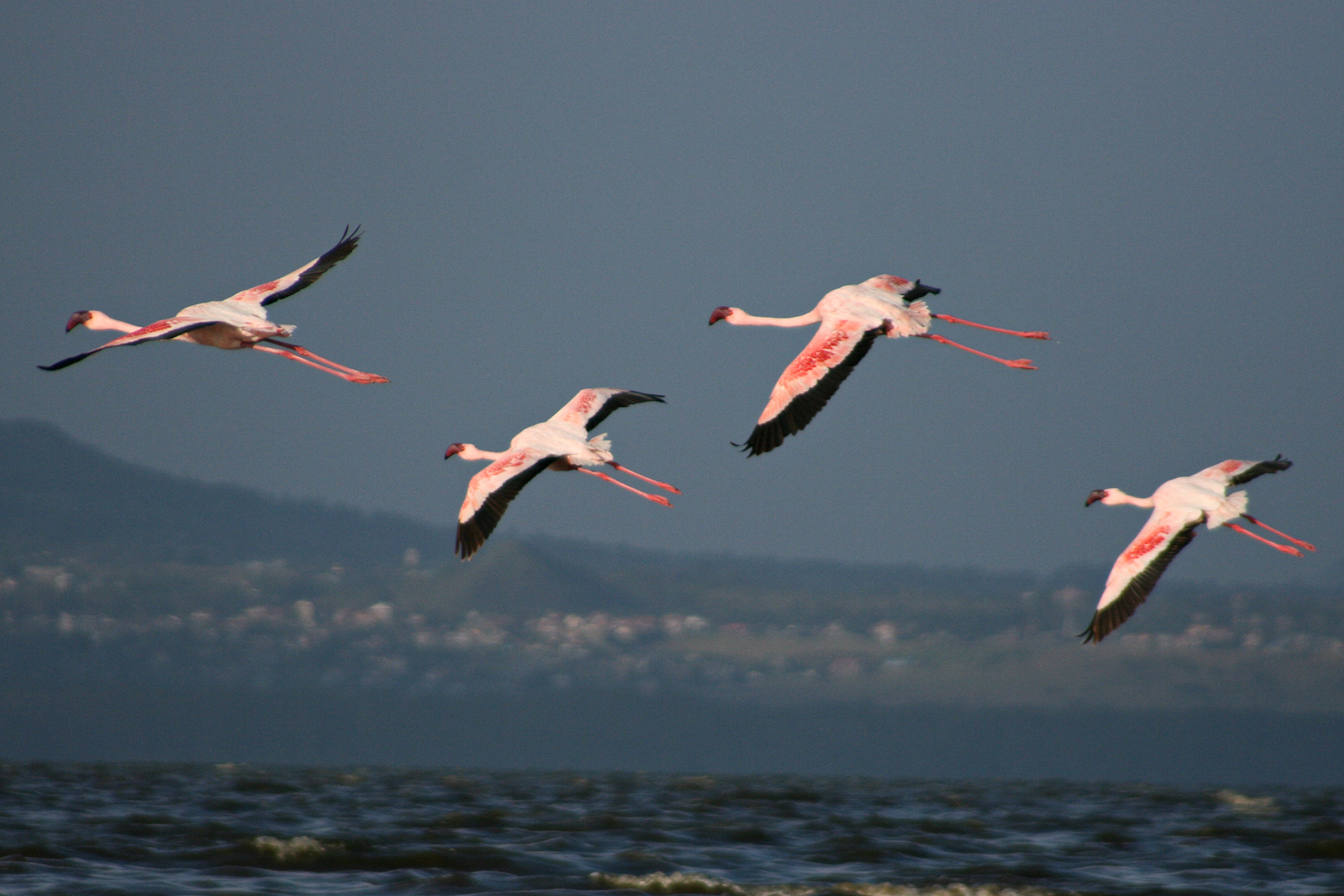 Flying lesser flamingos